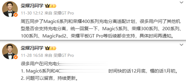 据CNMO了解,荣耀Magic6系列和荣耀400系列将率先获得更新,预计最快在12月底,最迟于1月初推送。对于用户广泛关心的其他机型,@荣耀冯同学明确回复称,荣耀Magic5系列、荣耀300/200/100系列,以及荣耀MagicPad2和荣耀平板GTPro等后续都将支持该功能,具体推送时间将另行通知。